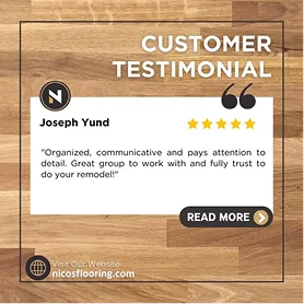At Nico’s Flooring, customer satisfaction is our top priority. We are committed to using positive words and phrases to provide an excellent customer experience. Our team is dedicated to delivering on our brand promise and ensuring that every client is completely satisfied with our services.
